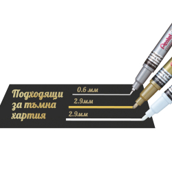Серията Super Gold и Super Silver се състои от 2 вида маркери с различна дебелина на писане - Pentel MSP10 с дебелина на писане 2.9мм и Pentel MFP10 с 0.6мм. И двата варианта предлагат супер златен, супер сребърен и бял цвят.
